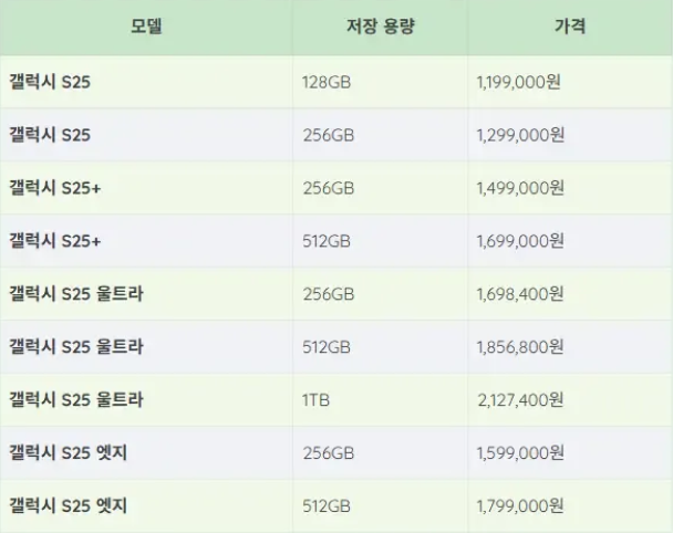 갤럭시 S25 시리즈 출고가 비교